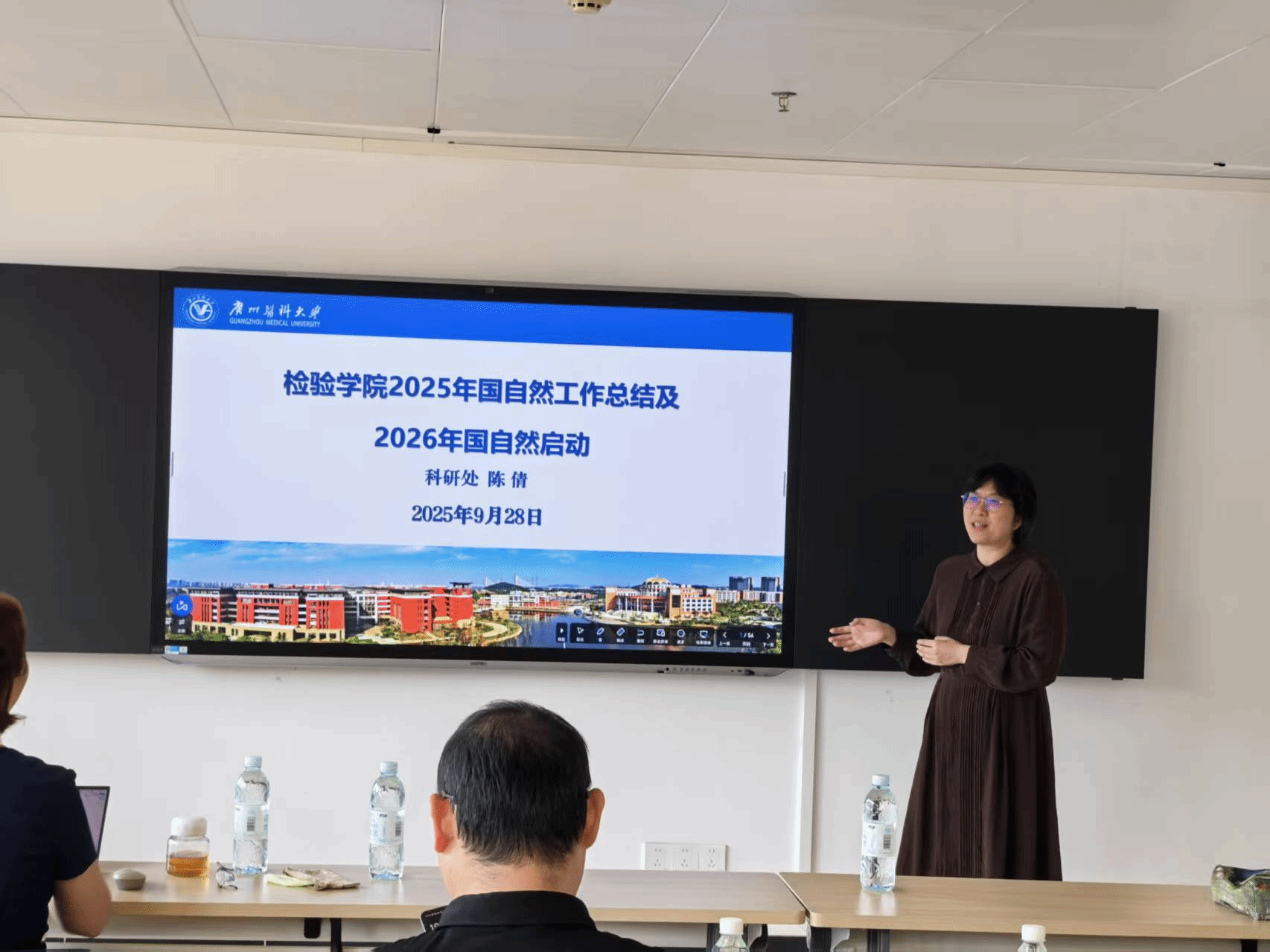 为系统总结2025年国家自然科学基金(以下简称“国自然”)申报工作经验,提前谋划、精准布局下一年度申报工作,近日,广州医科大学金域检验学院在番禺校区A2-632会议室举行了2025年国自然总结会暨2026年国自然启动会。学校科研处陈倩副处长,学院邓小燕副院长、王志刚副院长,科研办王立富主任,2025年申报国自然人员,2026年拟申报国自然人员参加了本次会议,会议由王志刚副院长主持。