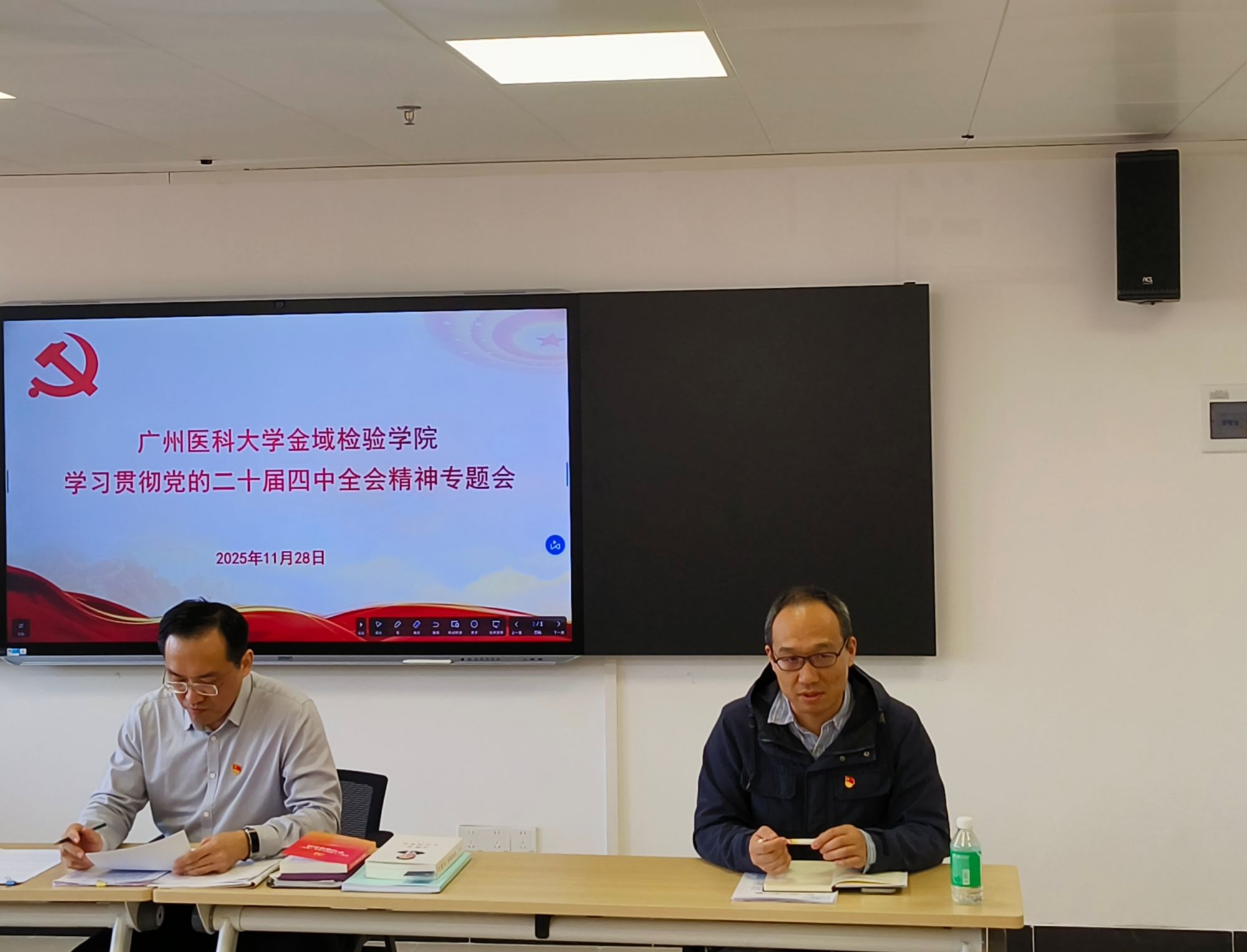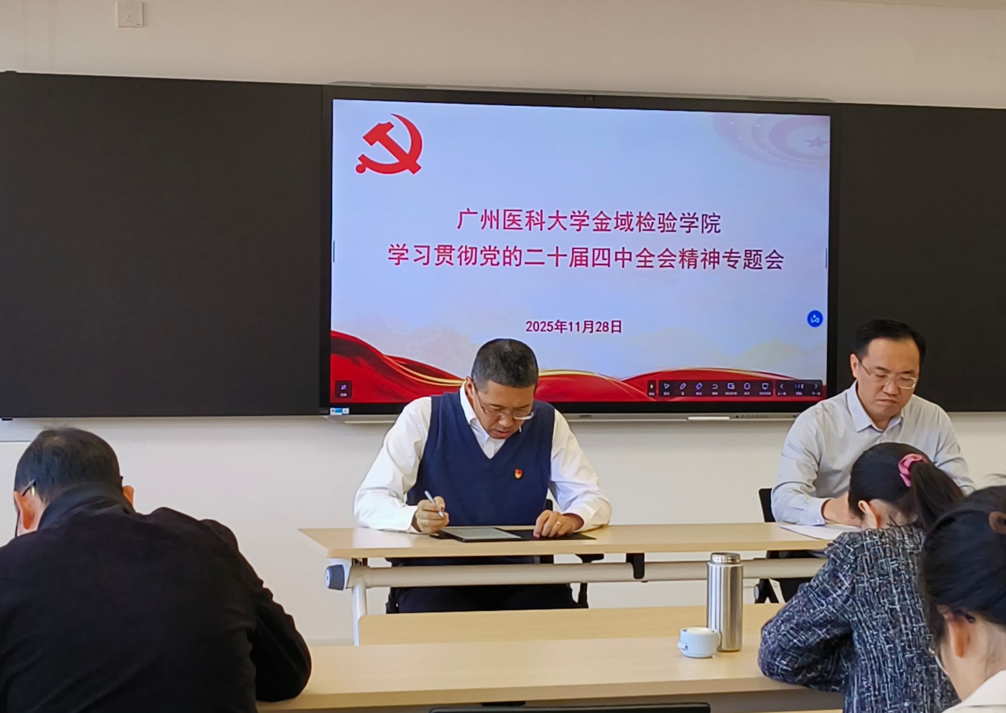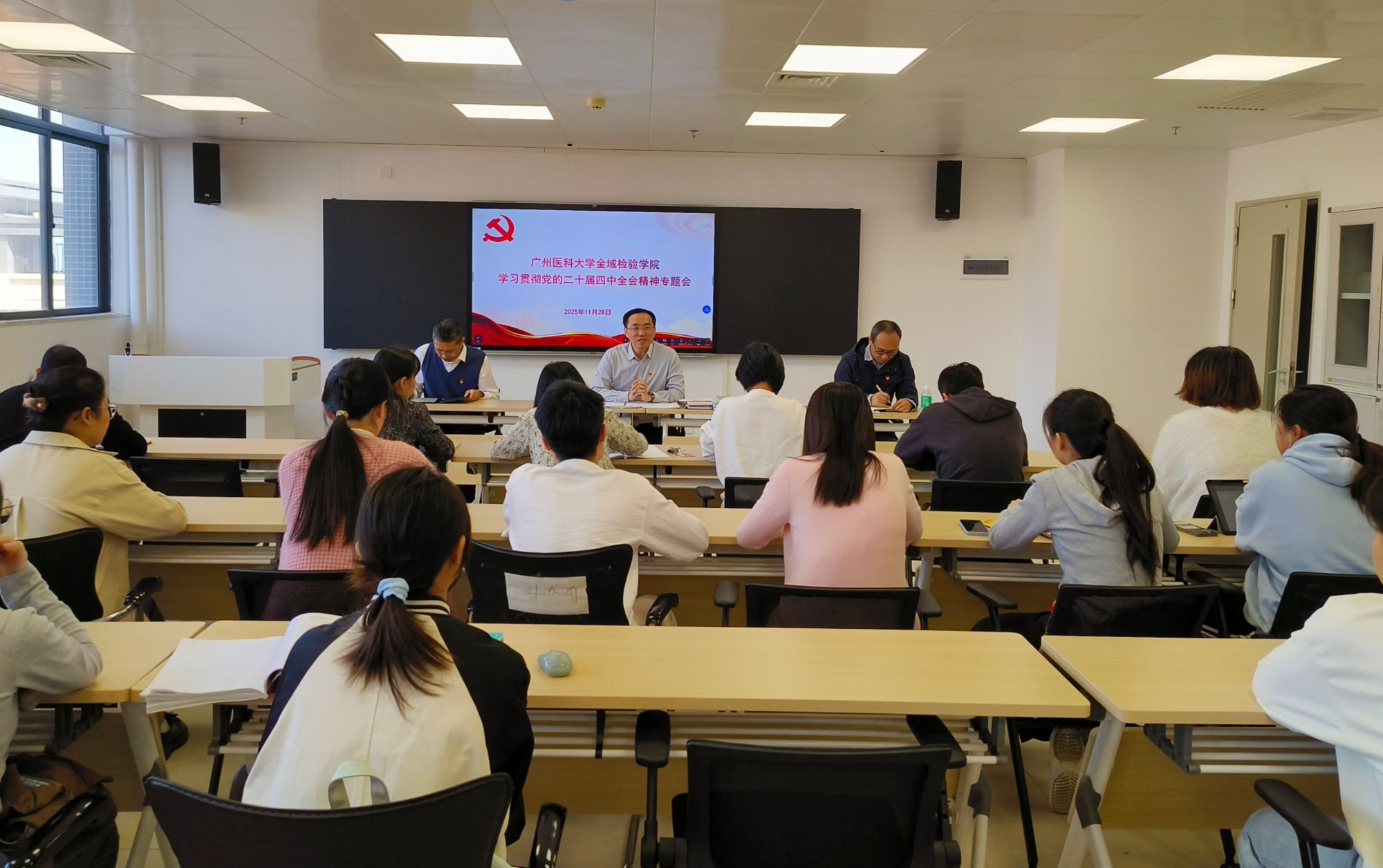 根据学校党委工作部署,11月28日,广州医科大学金域检验学院召开传达学习党的二十届四中全会精神专题学习会,学院党总支全体委员、党支部书记、党员和师生代表近40人参加会议,学院党总支书记曾王兴主持会议并讲授专题党课,就深入学习贯彻党的二十届四中全会精神,推动学院高质量发展作具体部署。