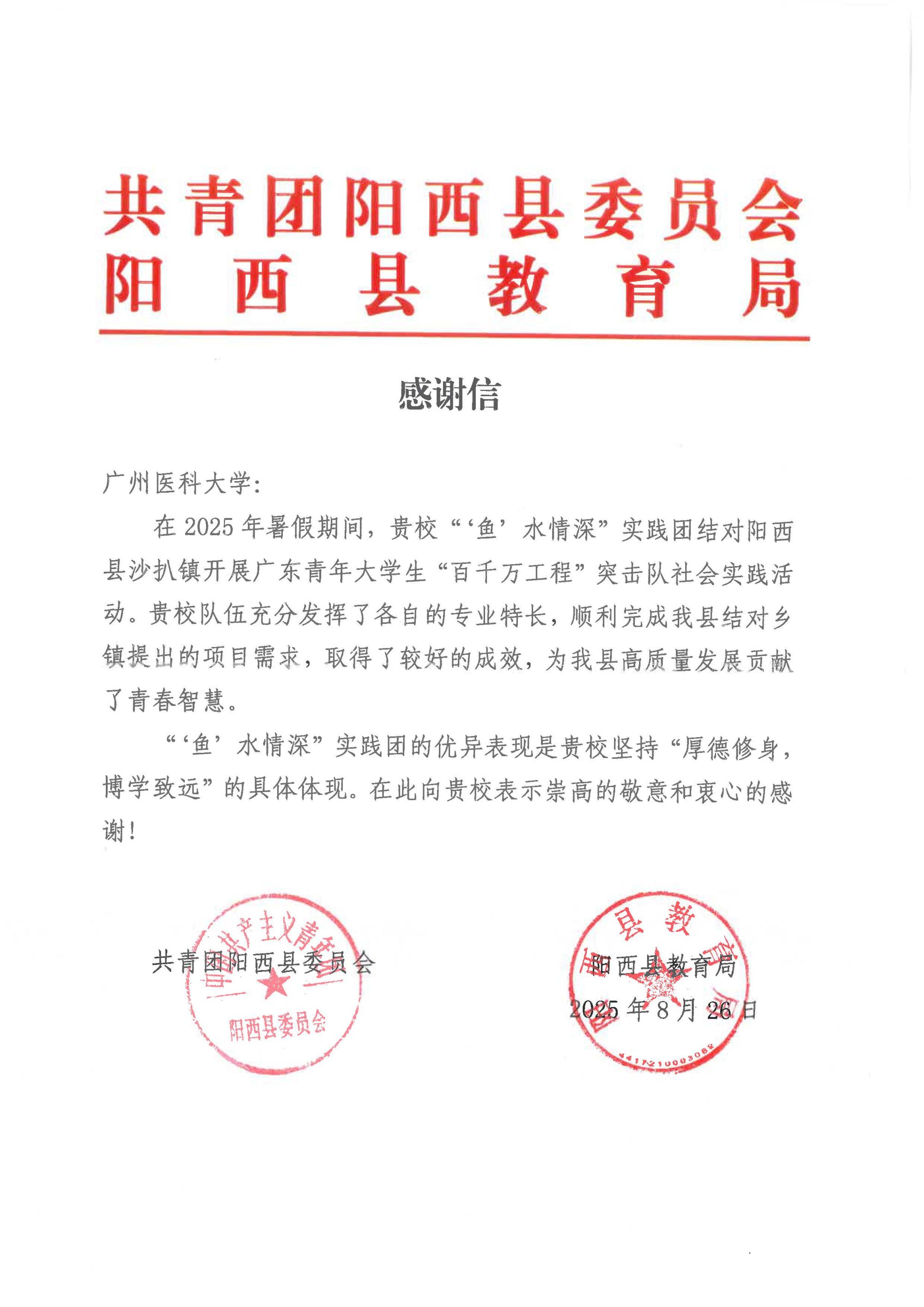 根据金域检验学院工作安排,为深入贯彻落实广东省高质量发展大会精神,积极响应“百县千镇万村高质量发展工程”号召,在广州医科大学团委指导下,学院学生办、院团委组织“鱼水情深”实践团,于2025年8月5日至7日奔赴阳江市阳西县沙扒镇,与金源海洋生物科研有限公司及当地社区开展深度结对实践。团队由学院团委书记许星杰老师带队,共7名师生代表,围绕水质检测、公益义诊、政策宣讲三大板块,多维度服务基层群众,以实际行动助力乡村振兴,彰显新时代医学青年的责任与担当。共青团阳西县委、阳西县教育局特向我院发来感谢信,充分肯定我院师生的工作并表示感谢。