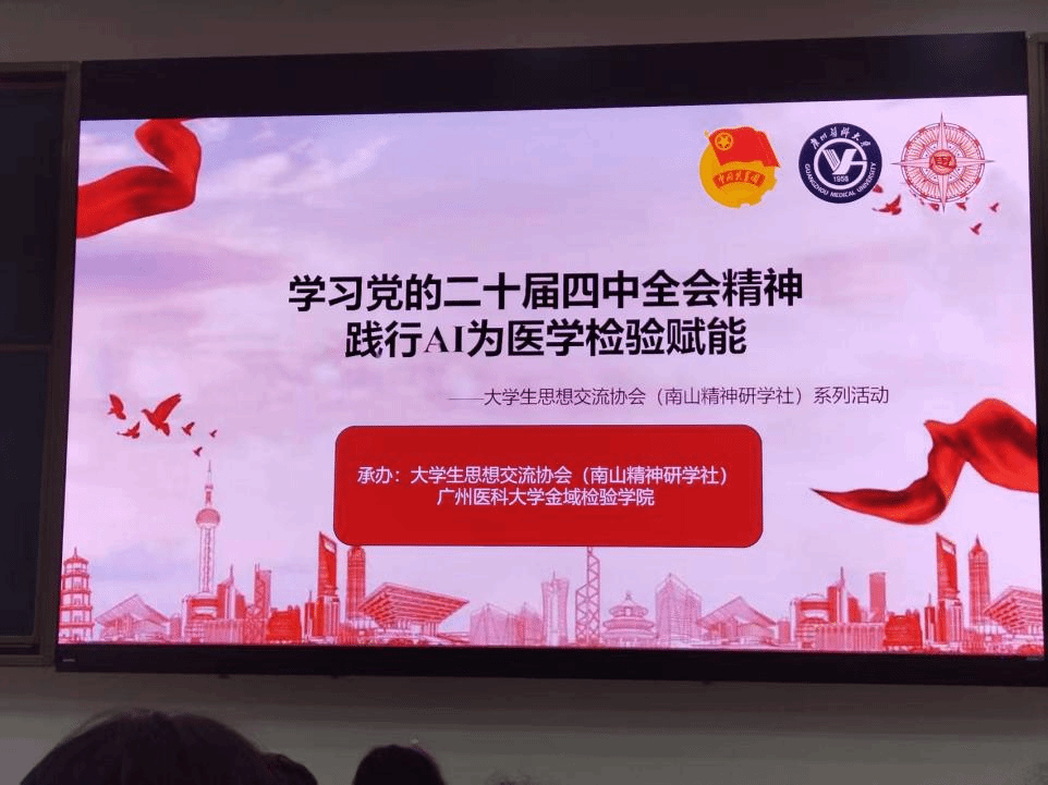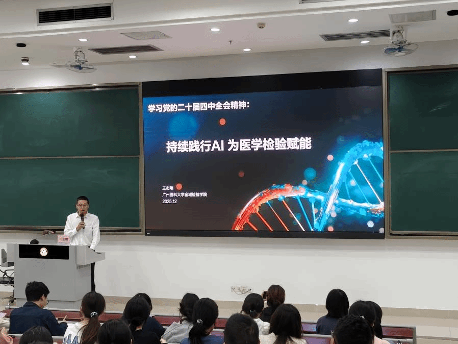 为深入学习贯彻党的二十届四中全会精神,探寻AI与医学检验融合路径,根据金域检验学院2025年“党建引领”工作安排,12月5日,学院在番禺校区A3-105课室举办“南山·医检学堂”学习交流会,学校学生社团大学生思想交流协会(南山精神研学社)指导老师、学院党总支曾王兴书记领学党的二十届四中全会精神,广州医科大学“南山学者”、学院副院长王志刚教授作“持续践行AI为医学检验赋能”主题报告,学生办主任刘剑霞老师,学院团委书记许星杰老师,大学生思想交流协会协会会长詹蕾同学、副会长吴佳丽同学和学生代表近200人参加,活动由协会副会长、我院团委副书记陈洁洁同学主持。