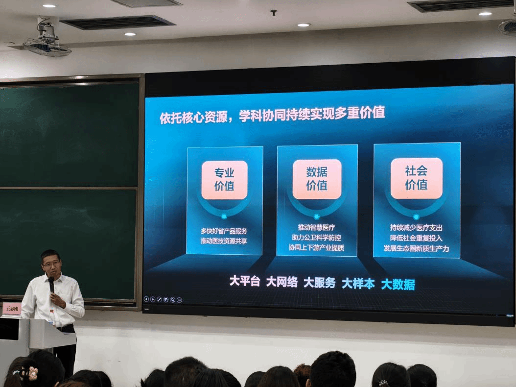 王志刚教授以“医学检验探寻AI赋能的实践”为主题,为我们讲授医学检验技术如何探寻AI赋能点,并分别从新时代背景、实践探索的各种案例以及思考与展望三个方面给予同学们谆谆教诲。根据习近平总书记“健康是幸福生活最重要的指标”,新时代为我国医检行业发展指明的方向,他指出医学检验是守护健康中国的"科技哨兵",在人民健康的方面占据至关重要的地位。同时展示了基于AI大模型开发诊断试剂、改良T-spot试剂等实践案例,帮助同学们了解AI赋能医学检验的前沿实践。
