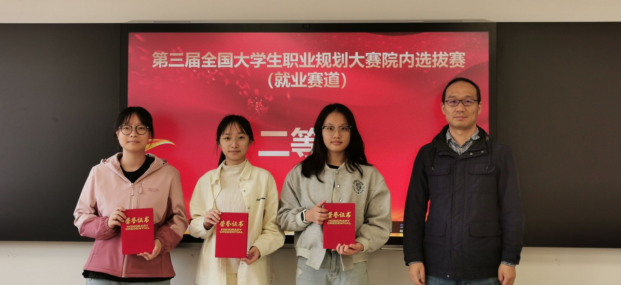 学院党总支副书记张迪为“就业”赛道二等奖:詹芸姿、陈颖诗、廖家颖等3位同学颁奖