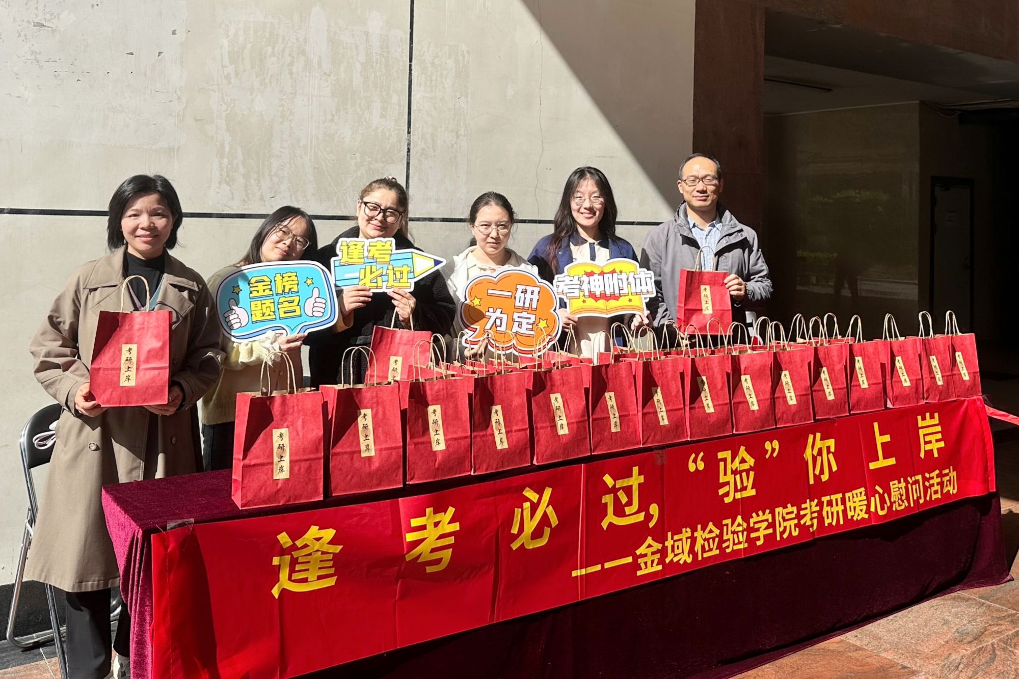 根据金域检验学院“党建引领”工作安排,在2026年全国硕士研究生招生考试即将举行之际,为做好2022级本科生考研服务工作,为学生加油鼓劲,缓解备考压力,学院于12月15日至16日分别在越秀校区和番禺校区举办考研学生慰问活动。学院党总支曾王兴书记、邓小燕副院长、张迪副书记、王志刚副院长,学生第二党支部书记、学生办主任刘剑霞老师,院团委书记、学生办许星杰老师参加活动。