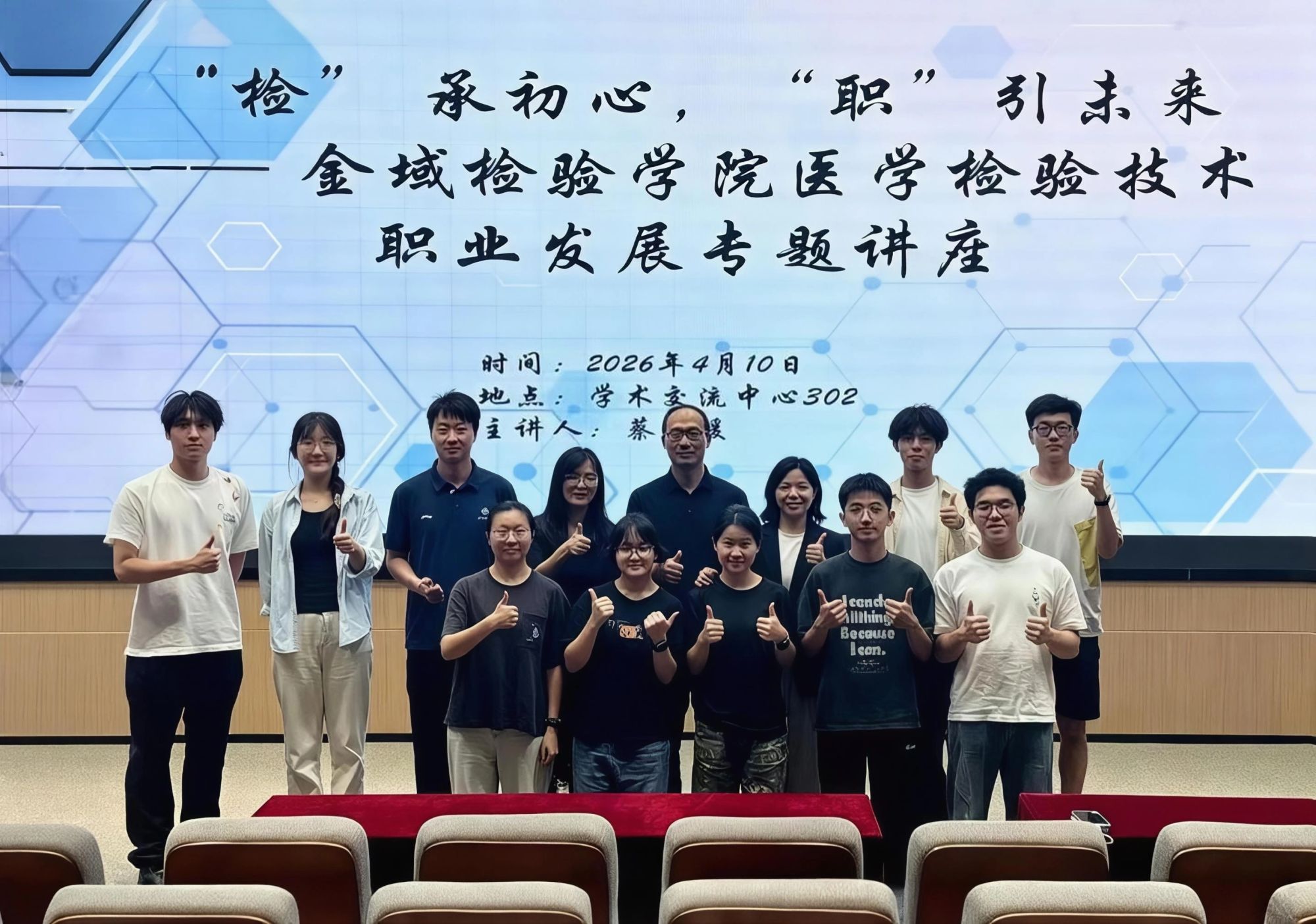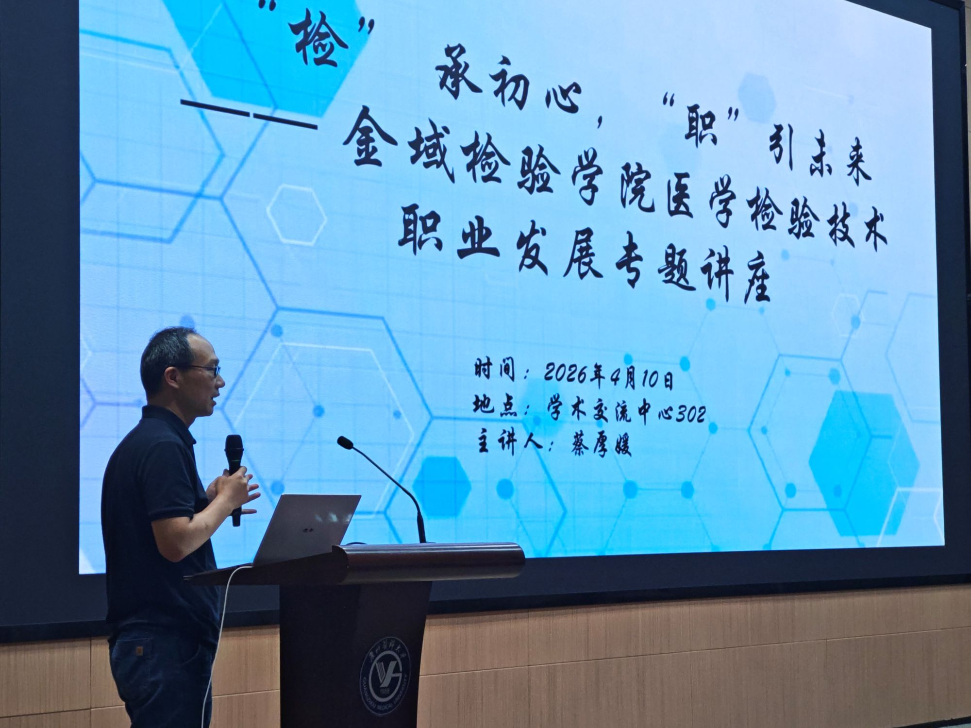 根据金域检验学院2026年工作安排,为增强学生的就业竞争力,助力学生科学规划职业生涯,4月10日晚,学院在番禺校区学术交流中心举办“‘检’承初心,‘职’引未来”——医学检验技术专业学生职业发展专题讲座。此次讲座特别邀请广州金域医学检验中心有限公司人力资源部高级总监蔡厚媛女士担任主讲嘉宾。学院党总支张迪副书记、学生办刘剑霞主任、院团委书记许星杰老师以及医学检验技术专业2023级、2024级、2025级学生代表共100余人参加讲座。