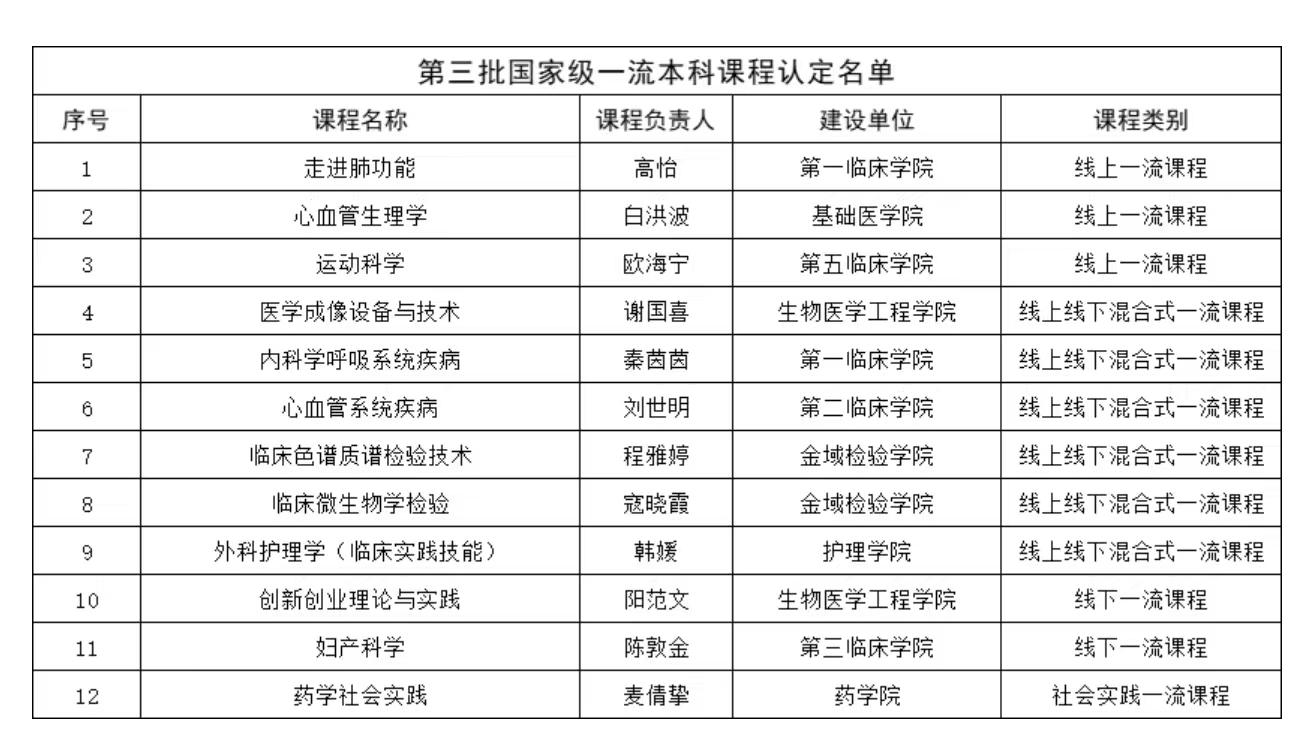 近日,教育部和广东省教育厅分别公示了第三批国家级一流本科课程和2025年度本科高校附属医院一流本科课程认定名单。我院《临床色谱质谱检验技术》与《临床微生物学检验技术》获批国家一流本科线上线下混合式课程,《临床分子生物学检验技术》获批广东省高校附属医院一流本科课程,标志着我院课程建设又上新台阶。